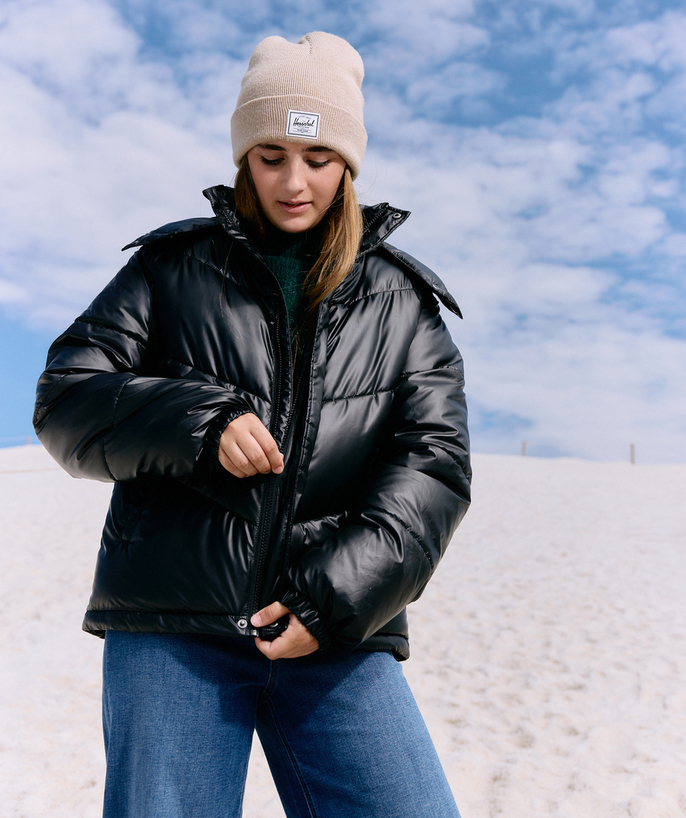 Doudoune fille noire brillante avec capuche amovible par zip jet black | Tape à l’oeil