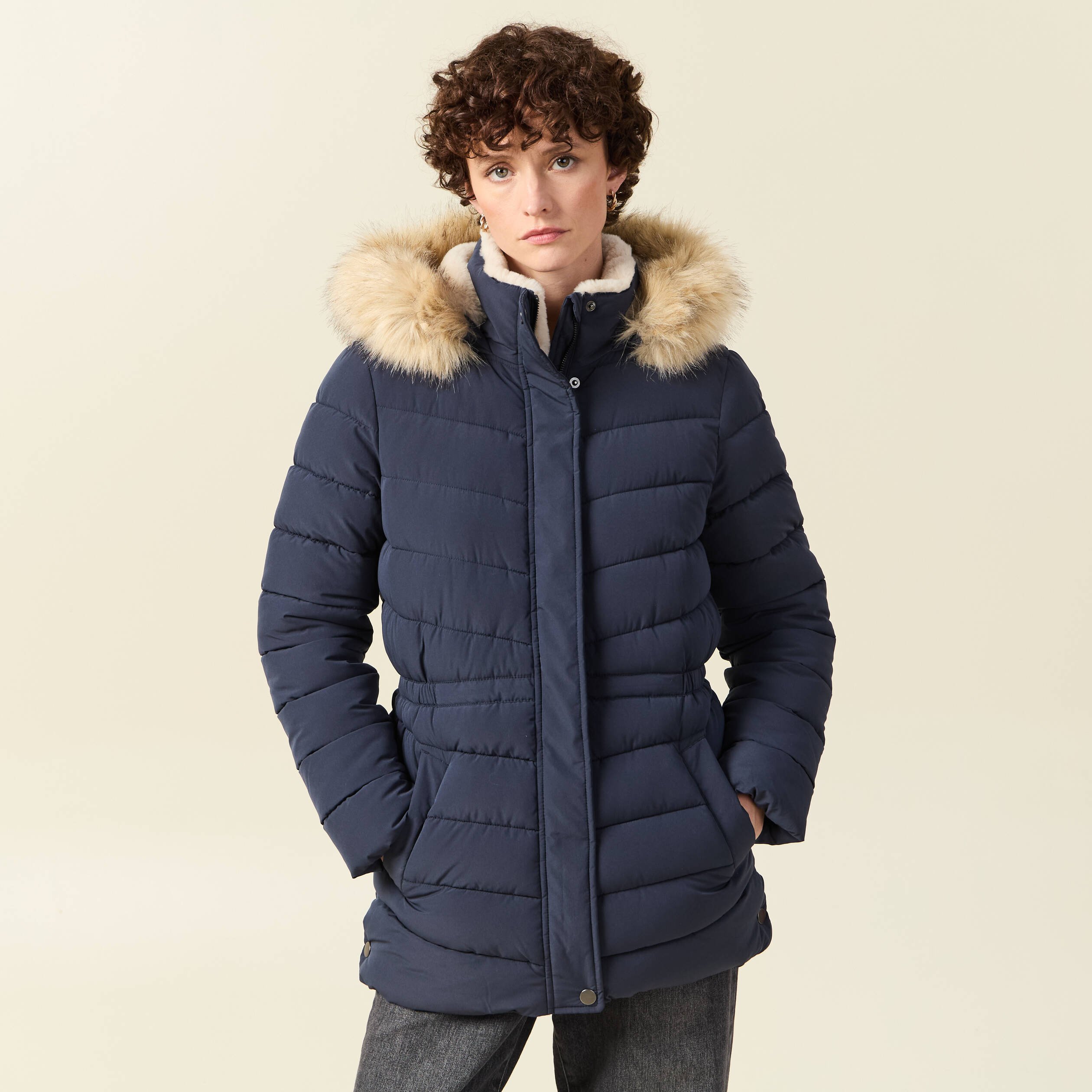 Doudoune à capuche fourrure bleu foncé femme
