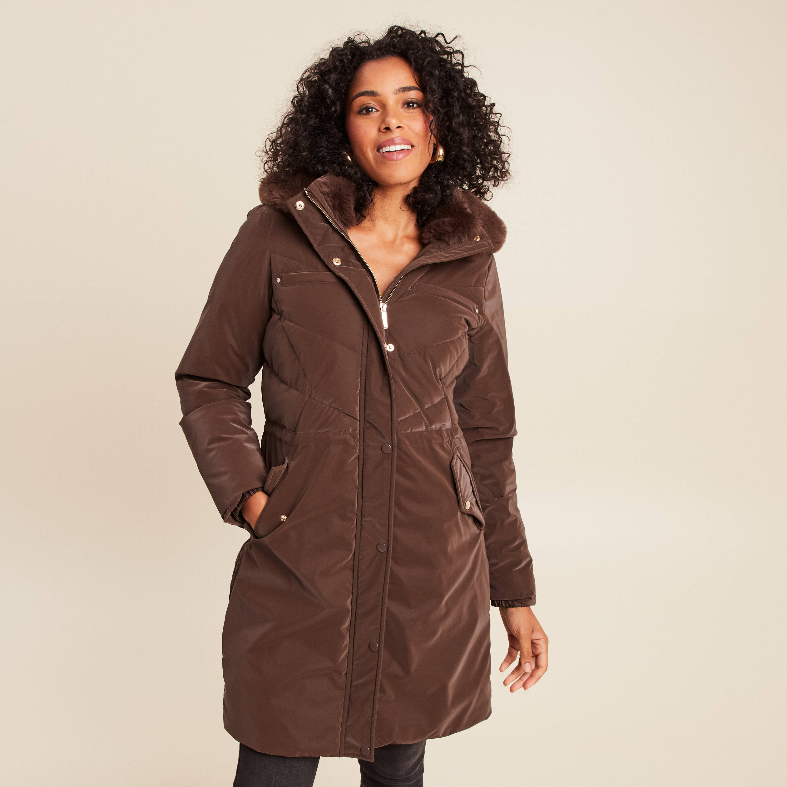 Doudoune déperlante cintrée à capuche marron foncé femme