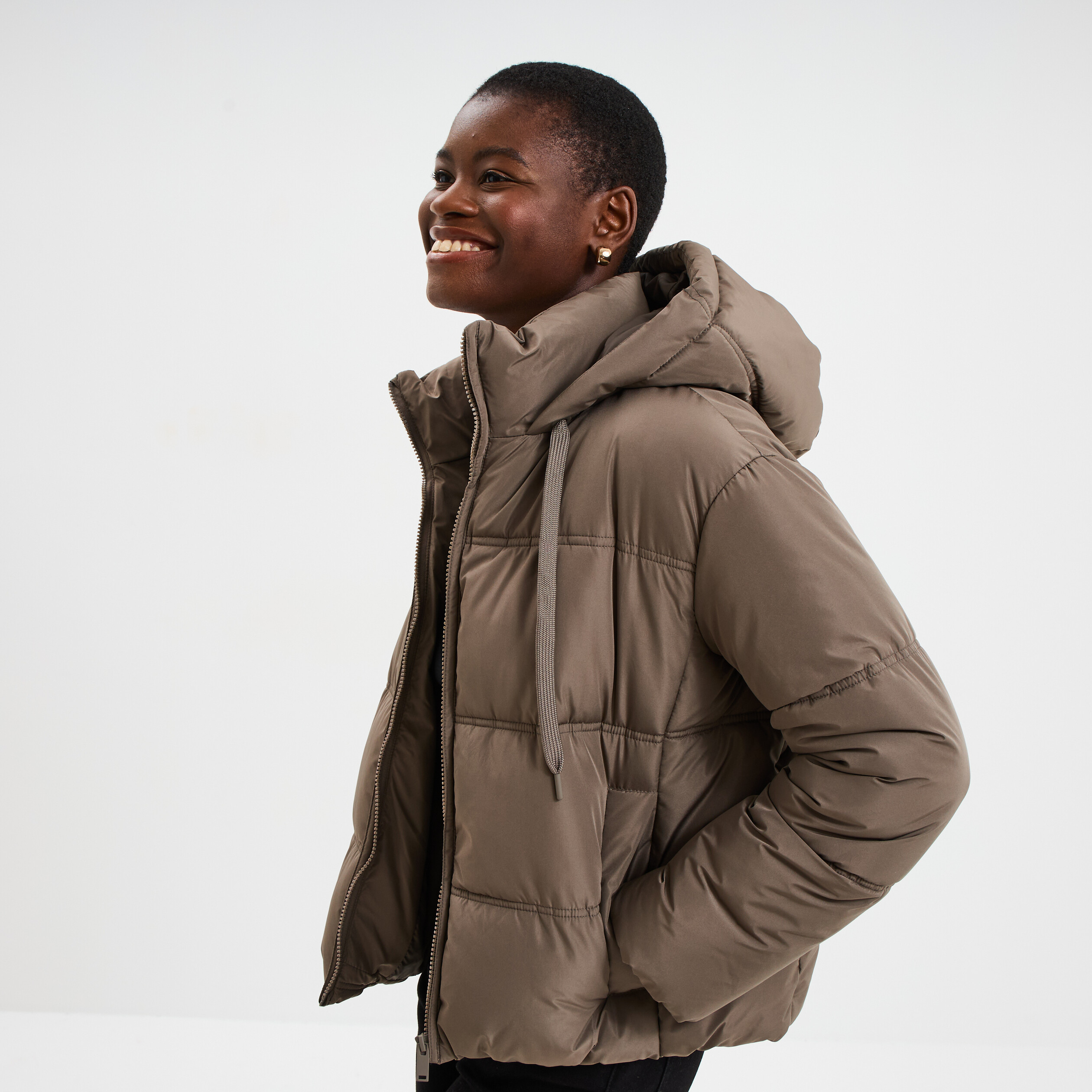 Doudoune courte droite doublée à capuche marron foncé femme