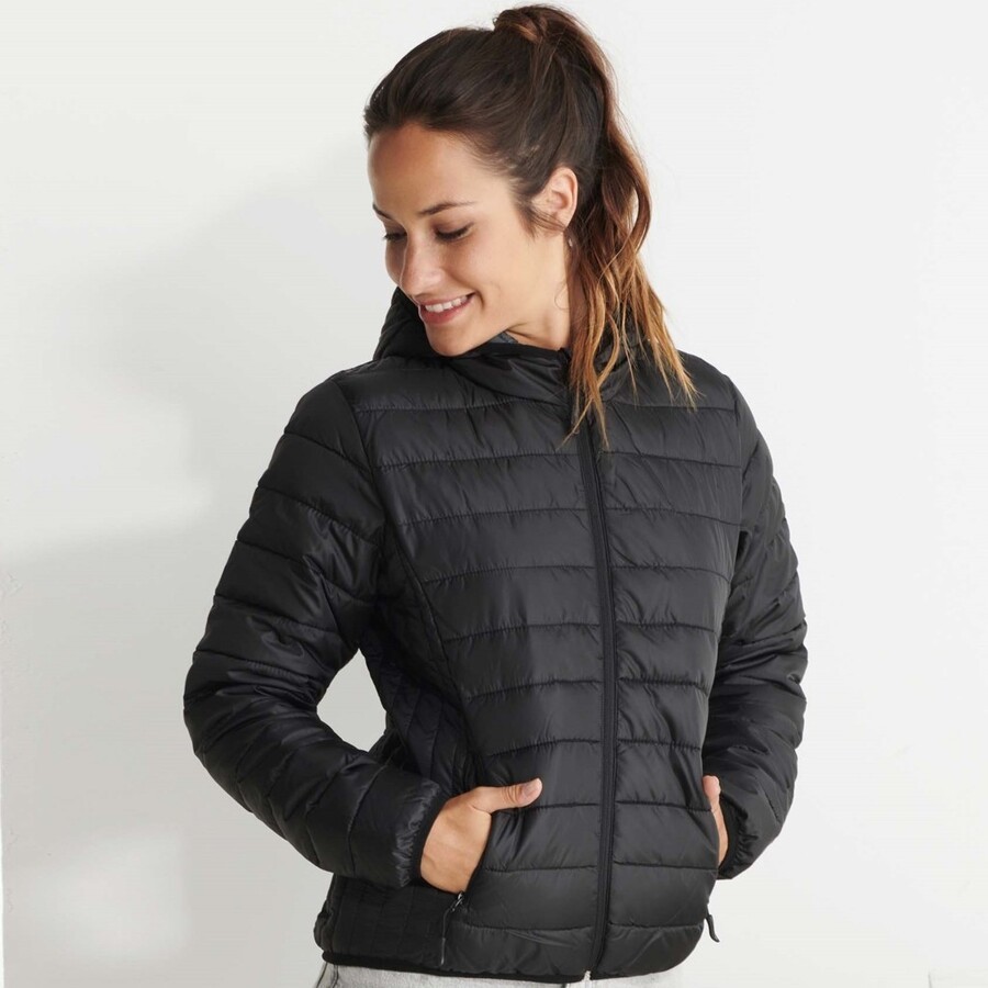 Doudoune femme à capuche matelassée avec rembourrage polyester touché plume, 290 g/m²