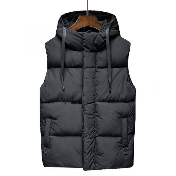 Doudoune épaisse à capuche sans manches pour homme avec poches.
